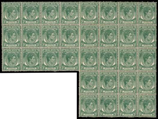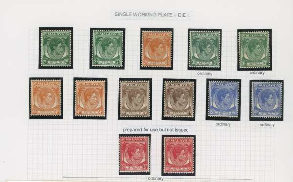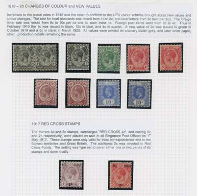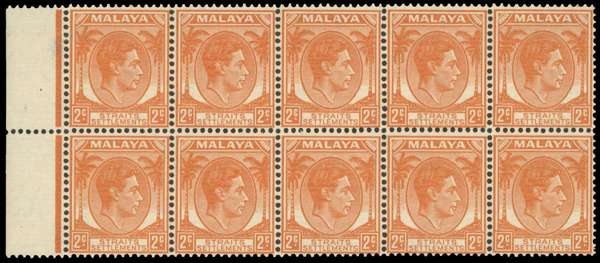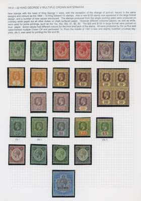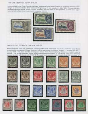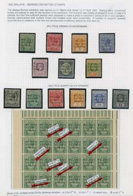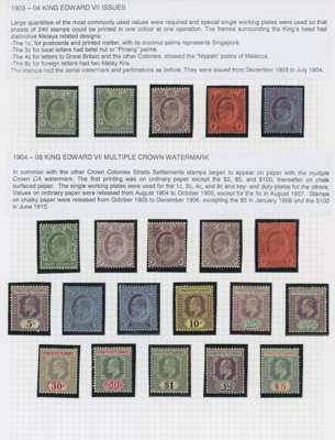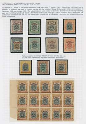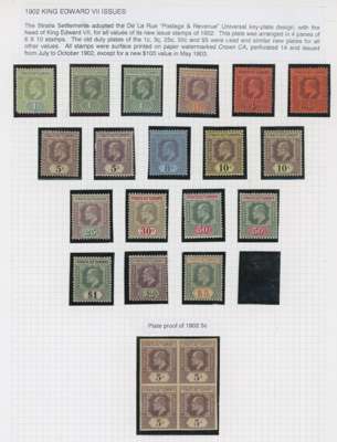 1902-1941 mint collection (345 stamps, of which 78 are largish multiples of inexpensive stamps), offered intact. 1902 set to $5, some toning, plus 5c Plate Proof block of four (also evenly toned), and a large part o.g. $100 Specimen; 1903-4 set; 1904-10 set ($2 and $5 offsetting from other values on reverse); 1906-7 Labuan overprints; 1906-11 set with papers ($5 washed), plus $25 Specimen; 1912-22 set with some shades, plus $25 Specimen (good appearance but a bit foxed on reverse); 1921-33 set to $5 plus $25 Specimen (both no gum, one washed) and $100 Specimen (no gum); Malaya-Borneo values to $2; 1936 set; Coronation Specimens, and 1937 set. Condition somewhat mixed but well worth inspection