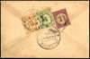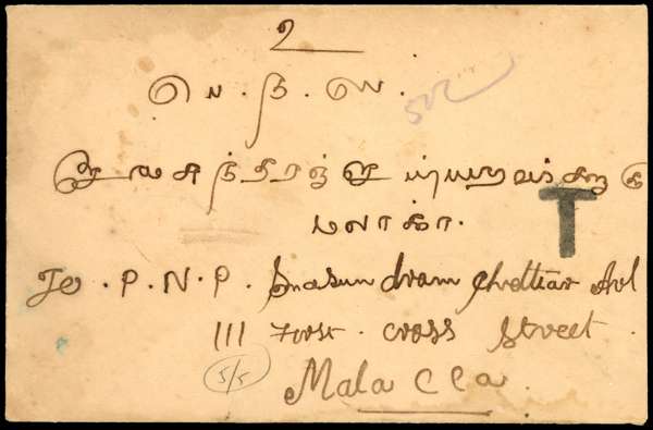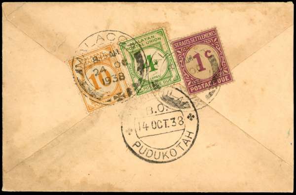 1938 envelope from India with (on reverse) MPU 4c and 10c plus Straits 1c Postage Dues, tied by Malacca CDSs of 24 OC 38, some toning
