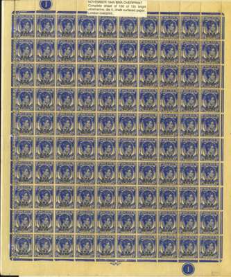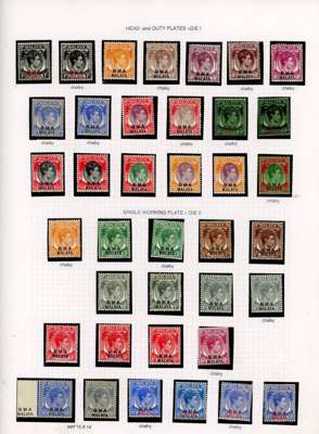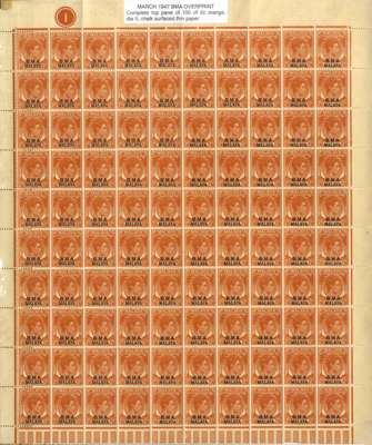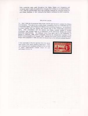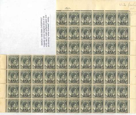 1945-8 mint collection on leaves (plus one stampless cover from the free-post period, used within Penang). We note 2c Die II block of 15 (14 unmounted); 2c striated paper pane of 100; 6c White Forehead block of 58; 12c sheet; set with shades (first $5 unmounted) and 15c overprinted on selvedge. Also Malayan Union 15c Victory with gum, unmounted, light toning