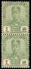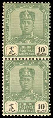 Johore 1922-41 $10 green and black on thin striated paper vertical pair SG 125a, £1,200.