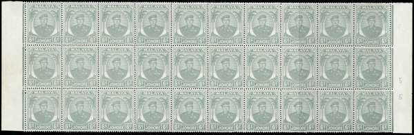 1949-58 6c pale grey, folded block of 30 (10x3) being three intact rows with sheet margin at left and right, the fifth stamp of the lower row clearly showing wmk error "St Edward's Crown" (W9b), brilliant unmounted o.g. A fine and rare multiple.