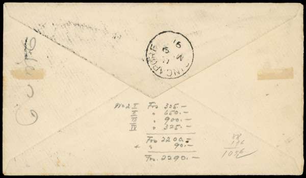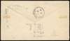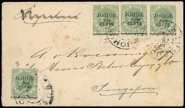 1891 (May 9) cover to Singapore bearing 2c on 24c green, one of each of the four types from the setting, tied Johore d/r cds in black and light “PAID/JOHORE” in red alongside, Singapore arrival on reverse. A most attractive and scarce cover. SG 17/20 £570+