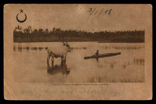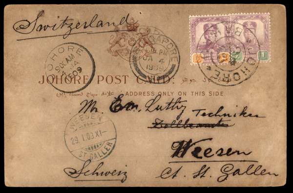 Postal Stationery. 1906 (stampless) card to Switzerland with 1c and 2c, undated Johore/ Bahru cancel. Johore CDS 4 JA 1909, Singapore transit of the same date and Weesen/ St Gallen arrival 21.1.09. Picture side shows ox, and boy in canoe, ‘Pasir Plangi Rubber Plantation, Johore’ with embossed Crescent and Star at top left. Dull and greyish, with a drawing-pin hole at top, but extremely scarce. Tan P2