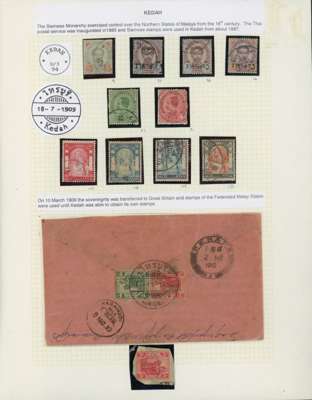 Thailand used in Kedah. Small range on album page with SG Z9, 31, 42, 46, 87, 91, 106, 108, 129 and 131; varying amounts of cancels visible and condition a little mixed. Also 1910 cover to India with FMS 1c and 3c on reverse, cancelled by Alor Star Thai datestamp (Proud D1) and a 3c on piece with small part of the same cancel