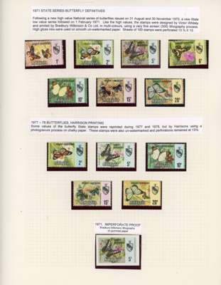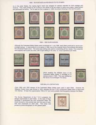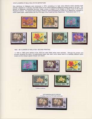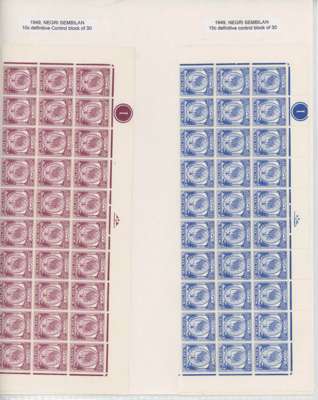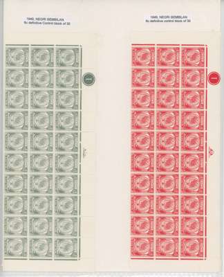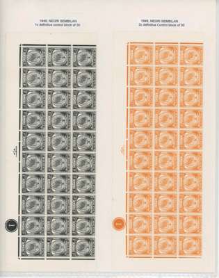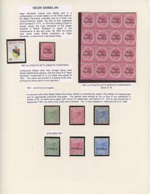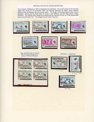 (And Sungei Ujong.) 1881-2007 mint collection on leaves with a fair range of Sungei Ujong including SG 10, 11 (Turpin guarantee), 13 no gum, 17, 20, 28-30, 32, 37-44 all in mixed condition; SG 49 o.g., SG 55 unmounted block of twelve and o.g. Specimen. Negri Sembilan with SG 1 block of sixteen unmounted, SG 2-4, 2s-4s, 1895-9 set o.g., surcharges, Survey Department essay Type I in brown, 1935 set and 2c orange complete sheet of 100 (some staining), thereafter a good degree of completion. Also 1949 original set to 50c bottom three rows of each, 1965 Orchids 2c corner ‘traffic light’ imperforate proof block and 5c yellow omitted unmounted, 1971 15c and 1983 10c imperf proofs, the latter a pair