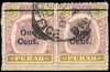 1900 1c on 5c dull purple and olive-yellow, type 46 surcharge, horizontal pair (R9/3-4 of the setting), neatly cancelled on fragment by part Taiping squared circle, the right stamp showing variety "Antique e in Cent". Very scarce used. SG 83, b
