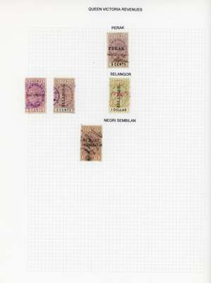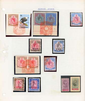 Revenues. Small used range on three pages including Straits KG VI $25 and $100 on piece, BMA $25 and $100, FMS Script $250 used and (apparently) unused without gum, Kedah Sultan $25 with Japanese Occupation chop, Malacca KG VI $25 pair (one with blunt corner) and $100, Perak $25 Elephants, Selangor $25 and $100 and Singapore QE $25 and $100. A fine unpicked group