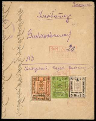 MONGOLIA: 1927 (19.1.) registered folded large envelope franked 5m, 25m and 50m tied by two framed Uliasutai date stamps in red, fine registration handstamp above, also in red, Ulanbator cds of same date on reverse. Very good strike of this short-lived cancel