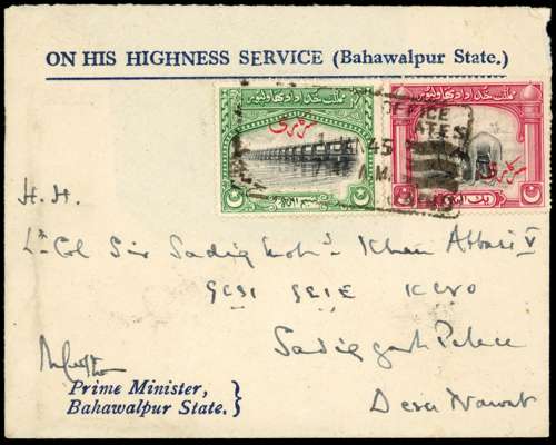 Officials. 1945 OHSS envelope from the Prime Minister's Office (signed by Crofton, and addressed in his hand), with ½a and 1a Officials, addressed to the Amir at Sadiqgarh Palace. Boxed Bagdad-ul-Jadid cancel on 1 JAN 45. Crest cut from flap, still a neat envelope. SG O1, 2