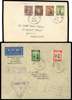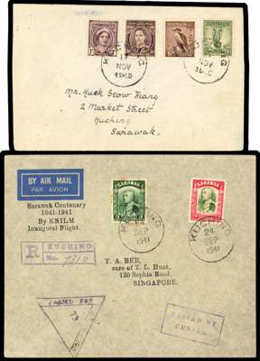 1941 KNILM Inaugural Flight envelope with 3c (foxing) and 20c, 24 SEP CDSs. Two Censors, one boxed and the other triangular (#73). Also 1945 local used envelope 17 NOV 45 CDSs cancelling Australia 1d, 3d, 6d and 1/-