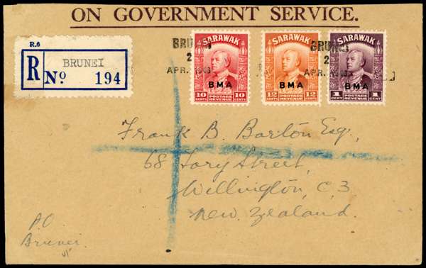 Postal History. 1946 On Government Service registered envelope to New Zealand bearing BMA 1c, 10c and 12c, two Brunei linotype cancels of APR 6. Singapore transit on reverse. SG 126, 133-4