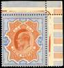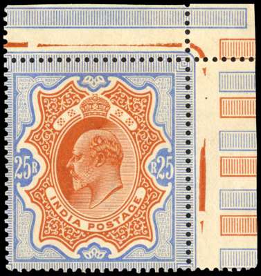 1902-11 KEVII 25r brownish-orange and blue, top right marginal, dried large part o.g. light gum toning, still of largely good appearance, scarce in positional form. SG 147 £3250