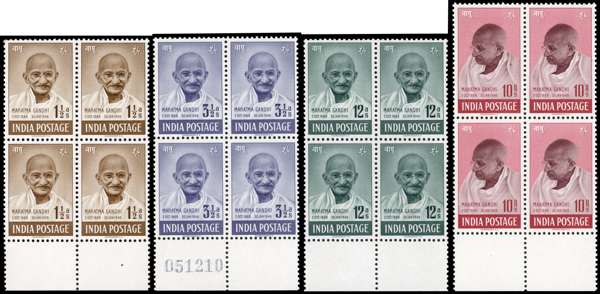 1948 First Anniversary of Independence ‘Gandhi’ set in lower marginal blocks of four, unmounted o.g. 10r top left stamp with natural gum inclusion, still very fine, scarce in multiples. SG 305-308 £1700+