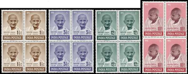 1948 First Anniversary of Independence ‘Gandhi’ set in blocks of four, unmounted o.g. 1½a block with small ‘s’ h/s on reverse and gum inclusion, 10r top left stamp with corner bend and right stamp with surface blemish, still largely fine, scarce in multiples. SG 305-308 £1700+