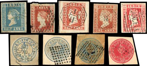 FORGERIES: selection of forgeries of the early issues of India, including: Engraved Forgery of 1852 Scinde Dawk ½a blue, with the desgin being blue against a white background (the reverse of the issued stamp) ‘used’ on piece by octagonal Sind District d/s for AU 7, 1852 Scinde Dawk good forgeries of the ½a blue (2, one artifically stained) and an old forgery of the ½a red cancelled by ‘dotted’ mark, and 1854-55 group of ‘used’ forgeries of the ½a and 1a (4) odd faults, an interesting lot.