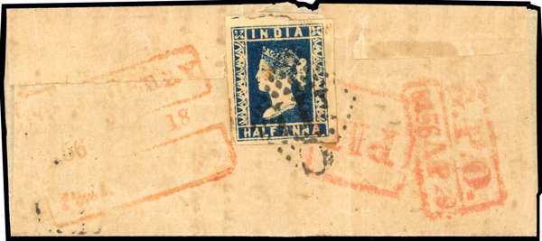 FRENCH INDIA: 1856 small native wrapper from Pondicherry to Madras, franked by ½a deep blue Die I, close to large margins, tied by clear strike from C-111 type 6 mark, with boxed despatch d/s in red at left, and Madras arrival marks in red, wrapper a little toned and stamp creased, still attractive and very scarce usage. SG 4