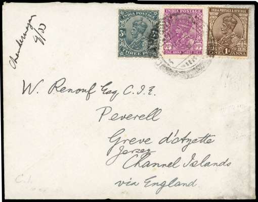 FRENCH INDIA: 1933 envelope from Chandernagore to Jersey, Channel Islands, franked by India KGV 1926-33 3p & 1a and 1932-36 1a3p, tied by individual strike from Changernagore cds, addressed by Col. D. R. Martin to W Renouf, two famous Indian Philatelists, a most interesting and scarce item.