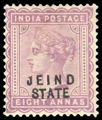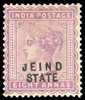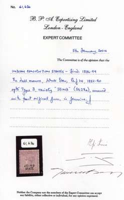 1886-99 8a dull mauve, error ‘JEIND’ for 'JHIND' variety, fine. large part o.g. very rare error, one of only seven recorded by us, including one in the Royal Collection. The overprint is coincidently triple, one inked and two albino impressions, probably unique thus. BPA Certificate (2004) SG 28a £2750