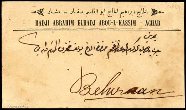 1915 (20 Jan) printed cover Persia to Bahrain bearing pair of 6ch adhesives tied Mohammerah cds and “OFFICIAL PAID/MOHAMMERAH/ 20 JAN 15” oval cachet in black, of which only four examples are recorded. Some aging, still a fine example.