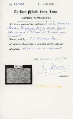1885 ½a blue-green,1a brown-purple, 8a dull mauve & 1r slate , opt type 2, each showing the ERROR 'PUTTILLA', the three lower values matching right marginal from R.1/12 (with first 'T' over 'S'), the 1r the right stamp of a horizontal pair, large part o.g. A marvellous group of this controversial error, which emanated from a trial printing of four panes ('500' stamps) of each value made about October 1885, shortly before the main printing (Nov 1885) of SG O7. The error occurred twice in each pane (? R.1/1 and R.1/12), so that just eight examples existed of each value, but two of each are now in the Royal Collection, leaving a possible SIX in private hands. SG 7-12var