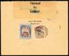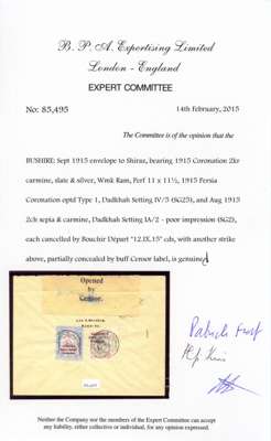 1915 censored cover to ‘J. Demetrius Esquire. Shiraz’, with ‘Leo. A. Malcolm Bushire’ black relief logo on flap, franked on reverse by 1915 'Coronation' 2kr carmine, slate & silver, (Dadkhah setting IV pos. 5) and 2ch sepia and carmine (Setting IA pos. 2) ried by individual strikes of cds with another alongside (partly obscured by black on buff 'G (Crown) R/ Opened by Censor label) A very rare and highly attractive cover, one of the earliest known uses of the Coronation issue on cover. BPA Certificate (2015) SG 2-25