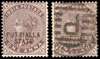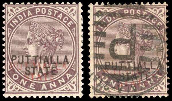 1885 1a brown-purple opt type 2, mint and used examples OVERPRINT IN RED AND IN BLACK, large part o.g. used example cancelled by hooded ‘P’ obliterator, fine pair, used examples are rare. SG 11a