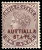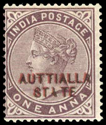 1885 1a brown-purple, opt type 2, in red and in black showing ERROR ‘AUTTIALLA’ from R.9/2, of the setting, large part o.g. typical centring and gum wrinkling, still very fine, a great rarity, desirable thus. One of only five examples in private hands ( besides two in the Royal Philatelic Collection and one in Tapling). RPSL Certificate (1975) SG 11ba £3250