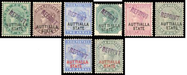 1885 group of ‘AUTTIALLA’ reprints set of 7 to 1r opt type 2 in black with additional 2a & 1r opt in red as issued, each with ‘REPRINT’ h/s in violet, part o.g. odd imperfections, still an interesting and scarce group, only one sheet of each value existed. SG 7a-12a
