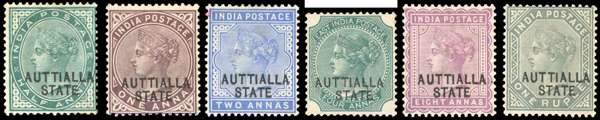 1885 group of ‘AUTTIALLA’ reprints set of 6 to 1r opt type 2 in black, WITHOUT ‘REPRINT’ h/s, no gum to part o.g. other odd imperfections, still an interesting and scarce group, only one sheet of each value existed, the 1a signed C. Stewart Wilson. SG 7a-12a (6)