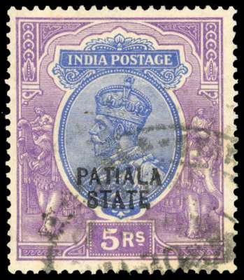 1912-26 single star wmk, 5r ultramarine & violet, used by hooded cds respectively, couple of odd shortish perfs, otherwise fine, very scarce genuinely used. SG 60 £450