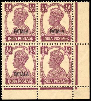 1941-46 KGVI ½a purple lower right marginal block of four, with fourth stamp variety WITHOUT OVERPRINT, as a result of a paper fold, the opt being printed on the reverse of the stamp and marginal selvedge, brilliant o.g. faintly toned gum as usually seen,, couple of insignificant gum bends (in addition to the paper fold), a great KGVI rarity, one of two known examples. Desirable thus. BPA Certificate (2020) SG 104a £12,000+