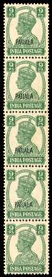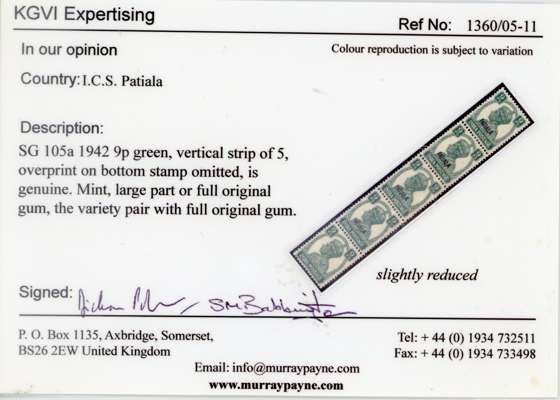 1941-46 KGVI 9p green, vertical strip five, with BOTTOM STAMP, ERROR WITHOUT OVERPRINT, brilliant o.g. (hinged on top stamp only), fractionally toned gum as usual and insignificant bends, a great and striking KGVI rarity. The opt was omitted form the foot of one sheet, yielding SIXTEEN possible pairs (!), but it is doubtful whether all have survived. KGVI Expertising Certificate. SG 105a £6000
