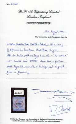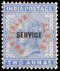 OFFICIAL: 1884 2a dull blue ‘SERVICE’ the rare essay with words of type 1 in red with opt more curved and ‘STATE’ measuring 10mm long, fine large part, few examples exist. BPA Certificate (2003) SG O3 essay. £1200 [See Part I footnote, p 327]