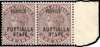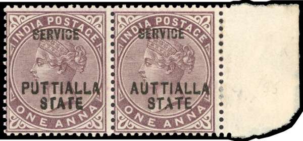 OFFICIAL: 1885 1a brown-purple, type 2 opt and type O2 opt in black right hand marginal horizontal pair, from March 1885 printing showing ERROR ‘AUTTIALLA’ on right stamp (R.9/2) fine o.g. very rare and desirable in this striking se-tenant form. Although 4000 (!) panes were optd, we have recorded just FIVE unused examples of this error in private hands, this being the finer of the two surviving in pairs with normal. SG O5c £1200+