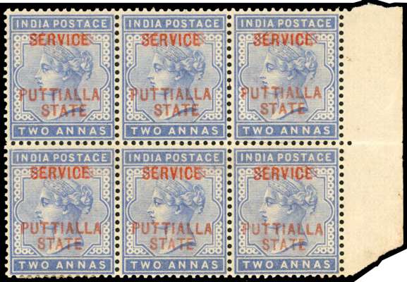 OFFICIAL: 1885-90 2a dull blue, opt type 2 & O3 in red, right hand marginal block of six with ERROR ‘SERVICE’ DOUBLE, ONE INVERTED, with the two opts superimposed, fine o.g. with four stamps unmounted, one stamp with slight crease (causing perf separation) and usual toned gum, still of fine appearance. RPSL Certificate (1979) SG O7a
