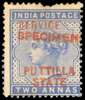 OFFICIAL: 1885-90 2a dull blue, opt type O3 in red ERROR ‘PUTTILLA’ SPELLING, optd ‘SPECIMEN’ Samuel type 15 in red, no gum, light tones and notch at top, otherwise fine and very rare, these errors are of uncertain origins, the only other example opt ‘SPECIMEN’ known to us in the Tapling collection. SG O7var [See footnote after SG O7 in Part I]