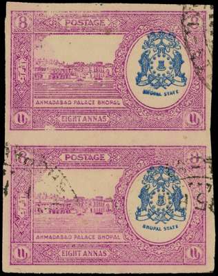 Officials. 1938 8a bright purple and blue vertical pair, imperforate and with SERVICE overprint omitted, lightly cancelled. Tiny toned flecks, otherwise fine with the usual washed-out appearance. SG O340e, £550