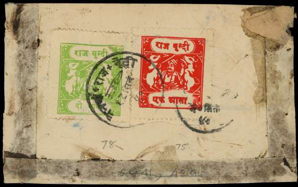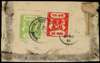 1939-40 native envelope with 1a scarlet-vermilion tablet Type H, perf 11, and 2a bright apple-green, Type I perf 11, tied by registered postmarks. Small faults and the envelope glue-stained, still quite a nice two colour franking. SG 75, 78