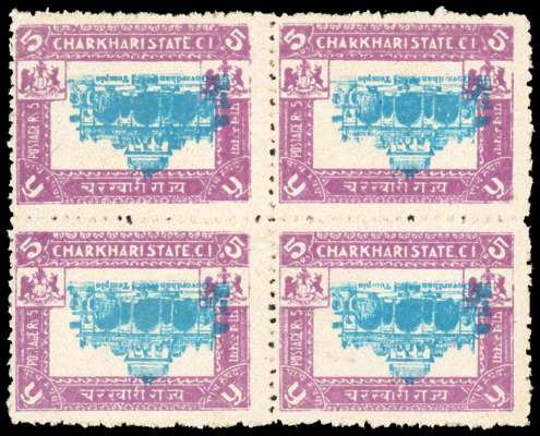 1931 5r turquoise & purple, perf 12 in block of four, ERROR CENTRE INVERTED, large part o.g. minor paper adhesions to gum, not detracting, still a spectacular and scarce item. SG 53b £900+