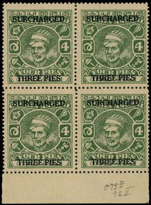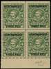 1943 3p on 4p green watermark Umbrella, lower marginal block of four, selvedge with light bend otherwise fine. SG 92, £760