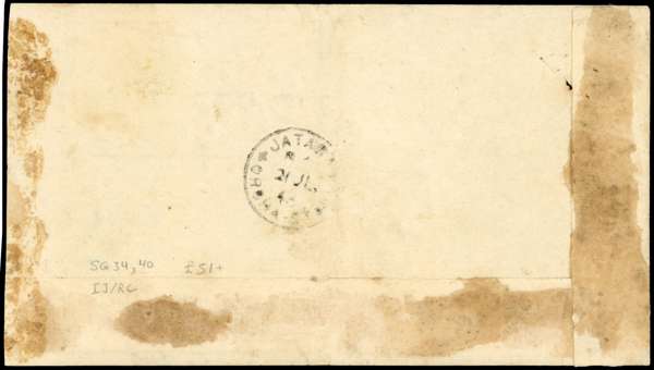 1939-45 pair of covers including: 1943 local cover franked by 1a scarlet and 4a slate tied by obliterator and State cds for 22 JL 43, backstamped by Jatara Orcha state cds for 21 JUL, second cover franked by ½a yellow-green (2, scarce) and 1a scarlet (3, composed of a vertical pair and single) tied by cds for 24 AP 45, with RPSL Cert (1980), some imperfection still attractive and scarce pairing. SG 32-40