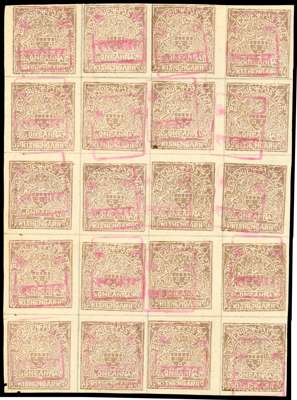 1a brown-lilac, imperf block of 20 (4x5) each bearing Kishangarh T1 handstamp in red. Usual spacing pin holes, still a very fine multiple. (cat £700)