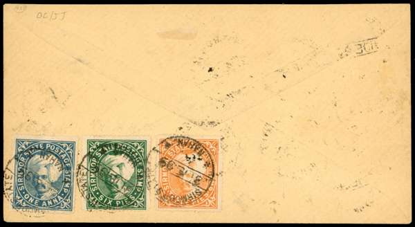1899 cover addressed to Austria franked by 1894 2a carmine, 1899 set to 1r vermillion, and on reverse, 1885-96 3p orange (type B), 6p green and 1a grey-blue, all cancelled by Sirmoor State cds for 31 DE 99, a most attractive an unusual cover, with Sirmoor stamps almost unobtainable properly commercially used. SG 9a-33