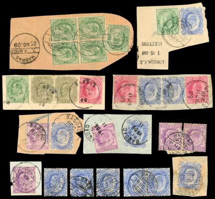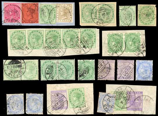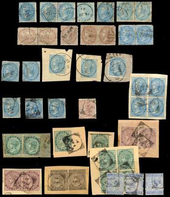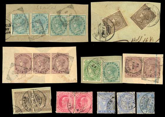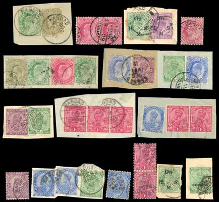 INDIA USED ABROAD: 1865-1910s duplicated collection of values, on and off paper, with pairs and other multiples, assorted issues and postmarks, including: 1865 Wmk Elephants Head issues, 1876 12a Venetian Red, 1882-90 values to 1r, 1900 new colours values, 1902-11 KEVII range and odd KGV issues with a couple of Officials, generally fair to fine condition, an interesting lot.