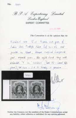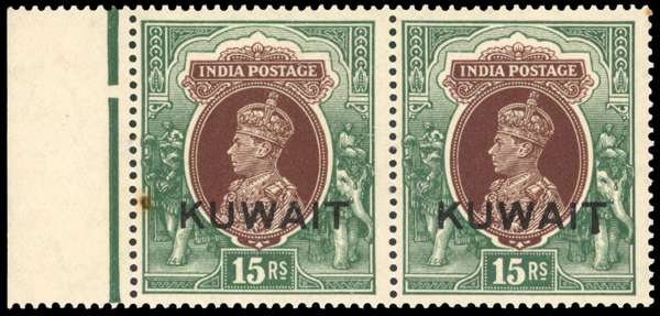 1939 15r brown and green marginal pair, upright watermark, right stamp with R3/2 LLP extended ‘T’. The normal stamp hinged and with a foxed spot; the variety stamp unmounted with excellent gum, extremely rare in this condition. Ex Donaldson. BPA Certificate (1979). SG 51a, £4500