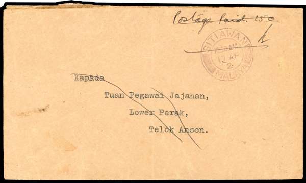 Postal History. 1942 envelope to Telok Anson with ‘Postage Paid 15c’ at top right and Sitiawan CS of 17 AP 2 (Proud D7). The envelope has subsequently been reused (label removed from reverse) with the address and markings on the front lightly crossed through. Light central fold and rather battered, a rare item, ex Rowell