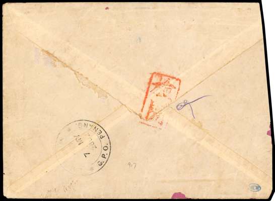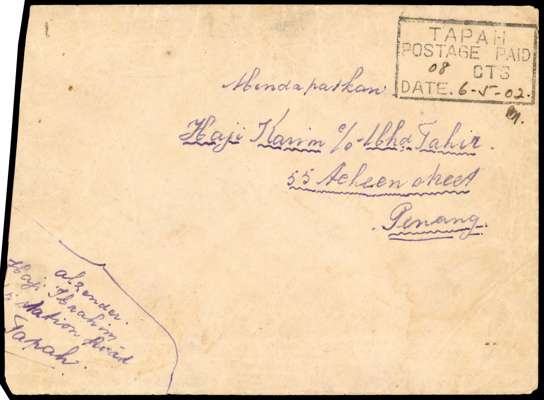 Postal History. 1942 envelope to Penang with black boxed TAPAH/ POSTAGE PAID/ (manuscript ‘08’) CTS/ DATE (manuscript 6-5-02) (Proud JPD2). Arrival CDS and Censor Chop on reverse. A little soiled and wrinkled; extends the Proud date range, ex Rowell
