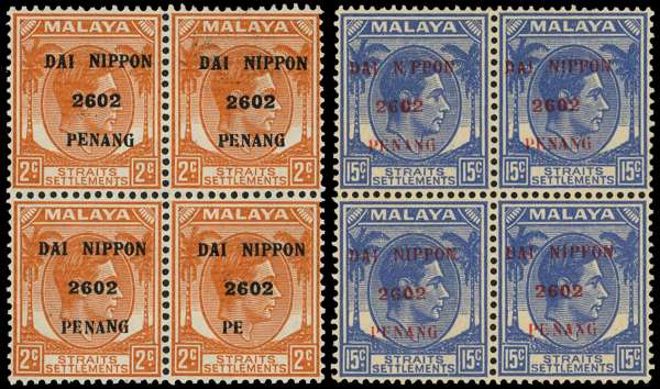 1942 Straits overprinted DAI NIPPON 2602 PENANG 2c block, lower right stamp with PE for ENANG, o.g. with the variety stamp unmounted; and 15c block, upper left stamp ‘N PPON’, unmounted o.g. SG J78a, J84a, £260