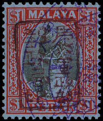 1942 Perak $1 black and red on blue paper with Chop A in brown, neatly used with violet special cancel, fine. Brandon Certificate (1995). SG J203a, £475