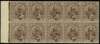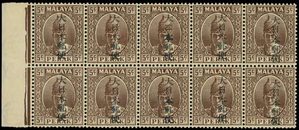 1942 Kanji overprint on Perak 5c brown left marginal block of ten, the middle stamp in the top row showing R6/3 second character sideways. Very fine o.g., hinged on one normal and the selvedge only. BP Certificate (1998). SG 275, b, £550